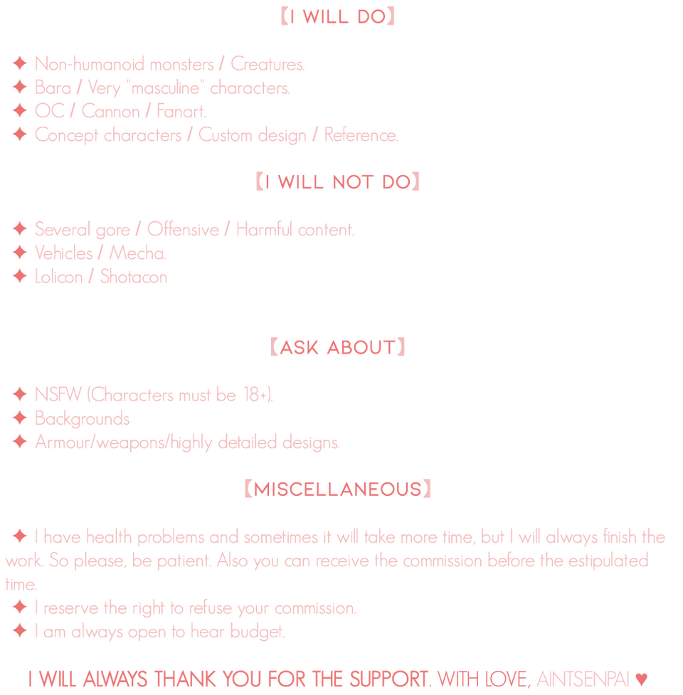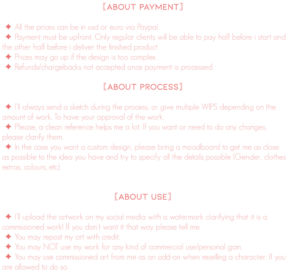 Please remember that prices can change with complex designs/backgrounds and extra things!**Also you can see more art references in twitter. **